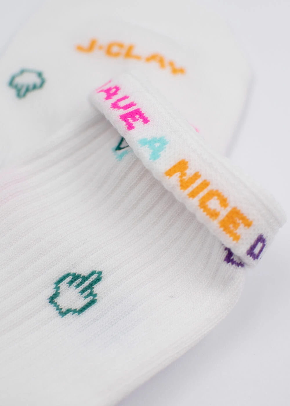Die „Have a nice Day“ Socken mit ihrem provokanten Mittelfinger Design, passen durch ihr schlichtes Muster auf weißem Grund zu fast jedem Sneaker. Perfekt für jeden Bankangestellten 😉