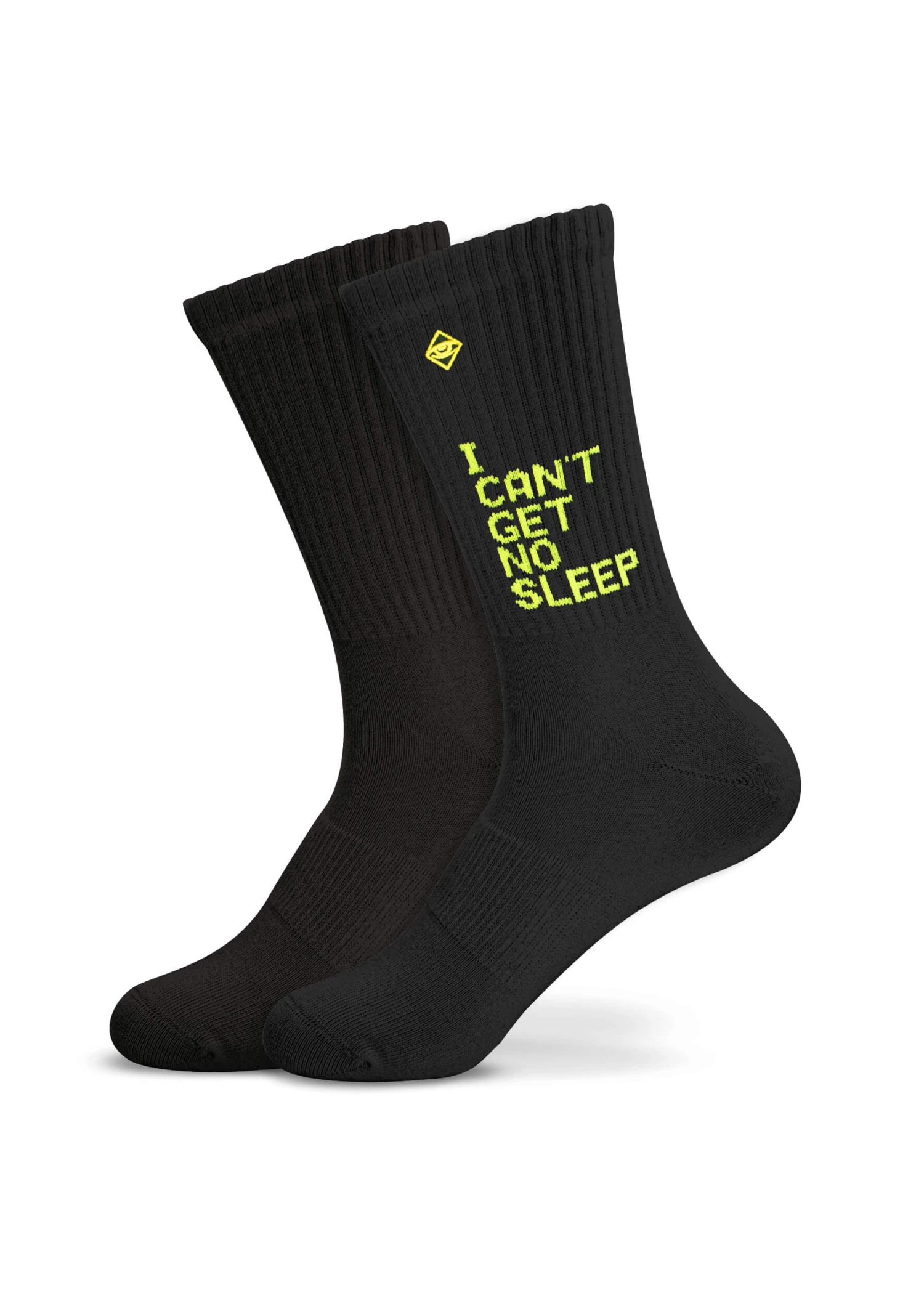 Die perfekten Socken für die nächste Partynacht. Schwarze Tennissocken mit Neonfarbenden „I can´t get no Sleep“ Statement.