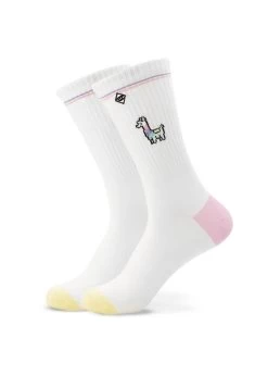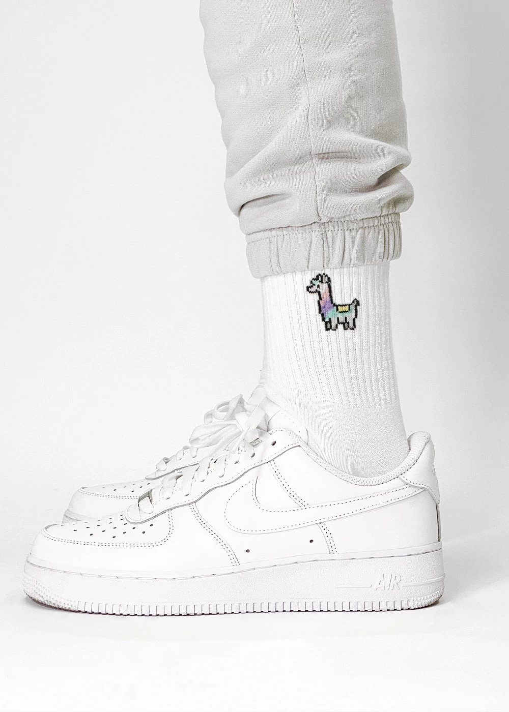 Weiße Tennissocken mit farbigen Lama Motiv. Pink abgesetztem Fersenbereich und gelber Fußspitze.