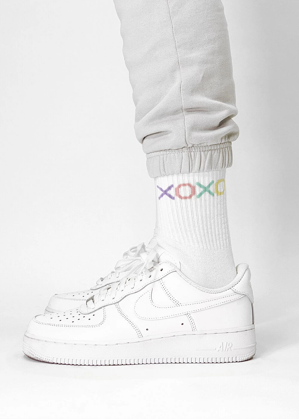 Weiße Tennissocken mit farbigen „XOXO“ Schriftzug. Violett abgesetztem Fersenbereich und pinker Fußspitze.